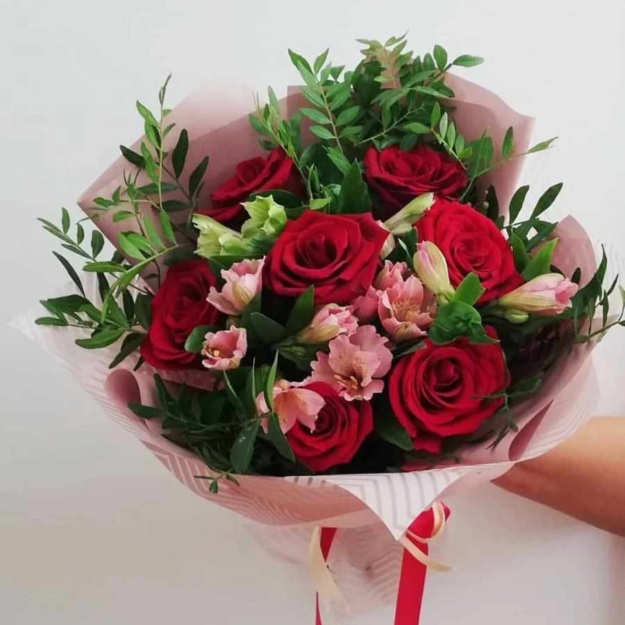 Цветы в букетеАльстромерии, Розы, Фисташка